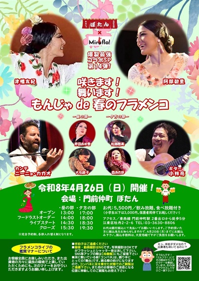 【4月26日】もんじゃ de 春のフラメンコ【昼の部】(オープン)13:00 (ライブスタート)14:30 【夜の部】(オープン)17:00 (ライブスタート)18:30